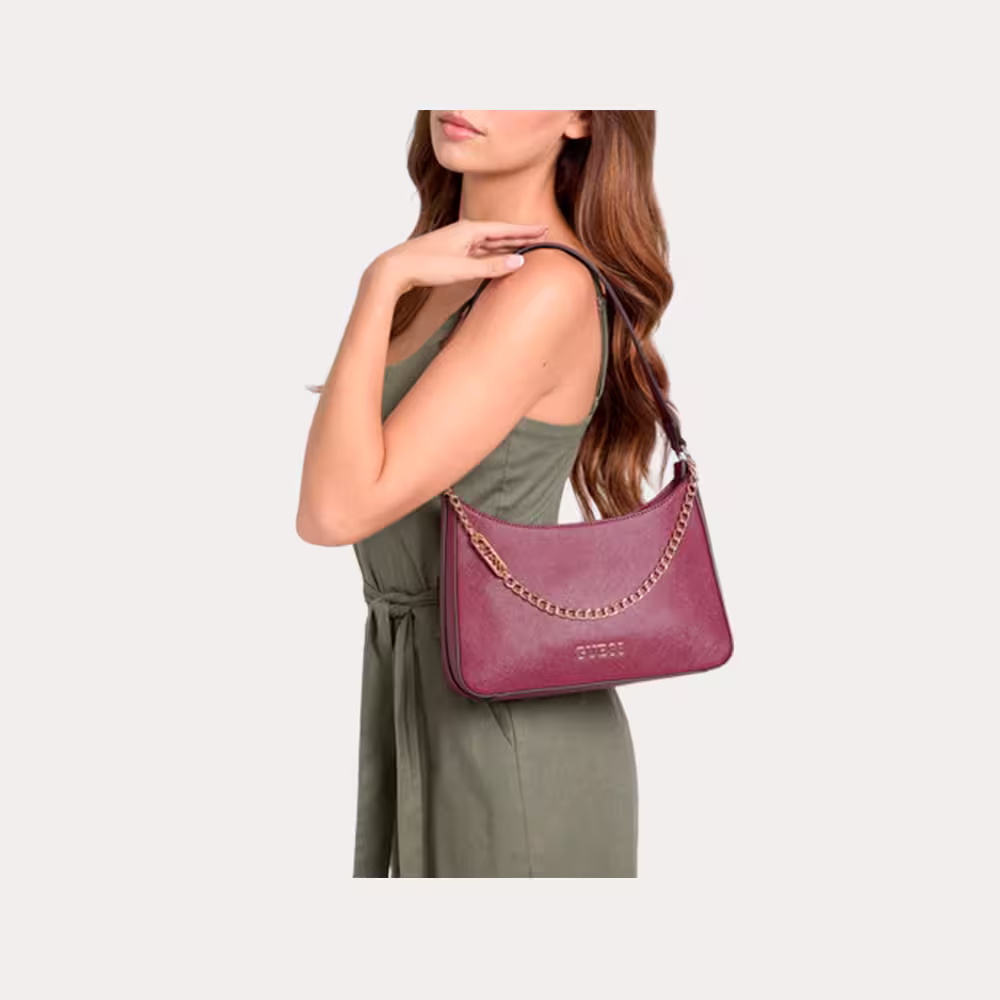 La Cartera de hombro Guess Deltona destaca por su silueta elegante y su textura suave de piel sintética con herrajes dorados brillantes con su logotipo frontal, interior organizado con forro y cierre superior con cremallera, cadena con dijes. Cuenta con una correa de hombro de 28 cm de longitud, que le aporta un aire moderno y sofisticado. Su tamaño compacto lo convierte en el accesorio perfecto para llevar lo esencial con estilo. El discreto logotipo metálico en el frente resalta la identidad de la marca con sutileza.